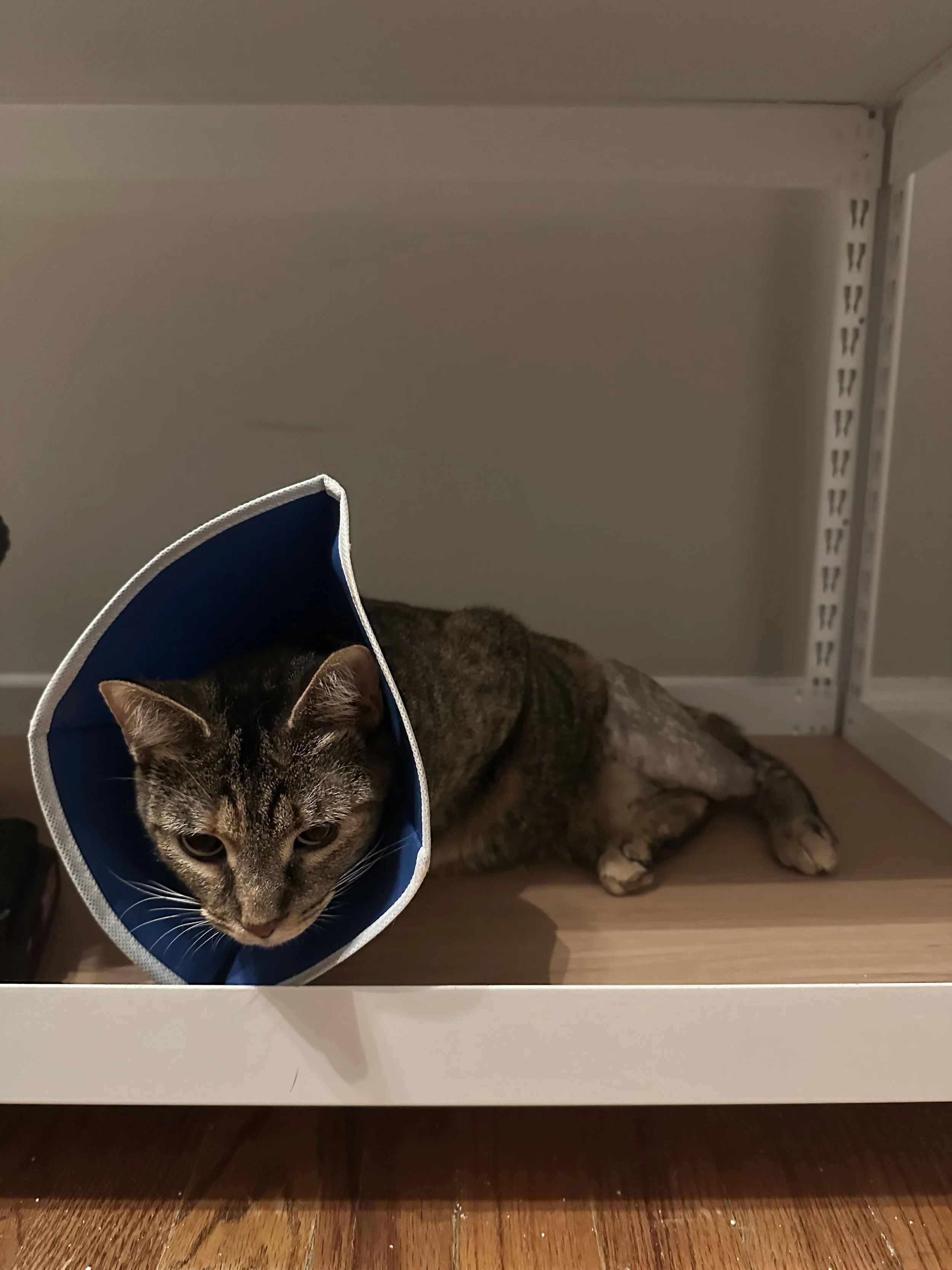 She's resting now, still pretty loopy from the anesthesia. The vet said it'll be three months before she's moving normally, and a full year to completely heal. So I'm deep in cat mom mode, making sure my lil baby has everything she needs.